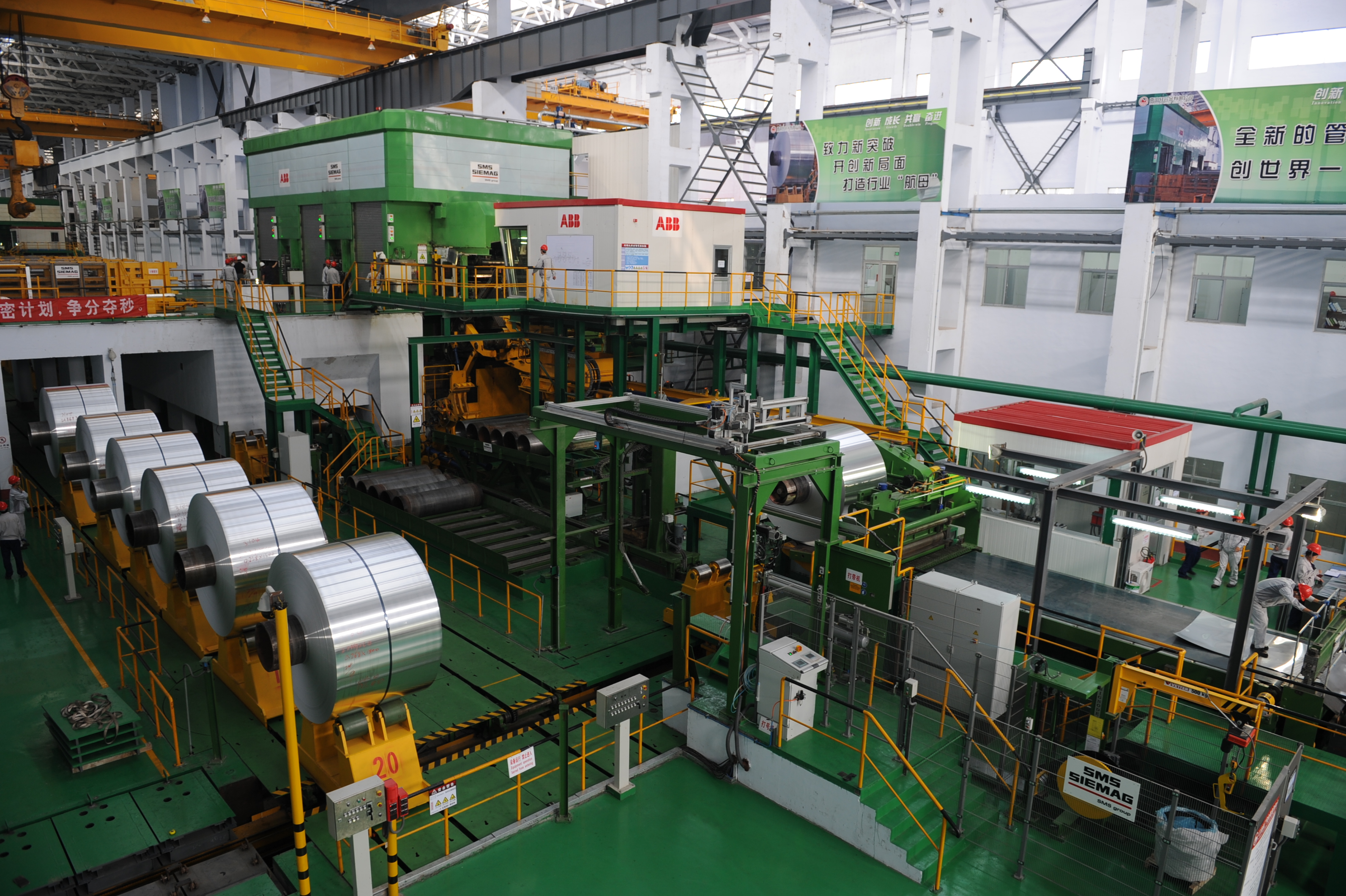 The main equipment of cold rolling plant includes two single-stand CVC 6-hi cold rolling mills (CRMs) and one three-stand CVC 6-hi tandem cold rolling mill (TCM). The cold rolling mill unit was jointly manufactured by Germany SMS and Sweden ABB; the equipment installation level has reached the world most advanced level. Main production is involved to 1xxx, 3xxx, 5xxx and 8xxx series of aluminum alloy, the main products are can body stock, can end stock and aluminum foil stock, with the highest unit speed 1800m/min, the minimum product thickness 0.1mm, the maximum product width 2100mm, the maximum product diameter 2800mm and the maximum strip coil weight 30 tons. The tandem cold rolling mill is the first and the most advanced aluminum sheet & strip cold continuous rolling mill unit in China.