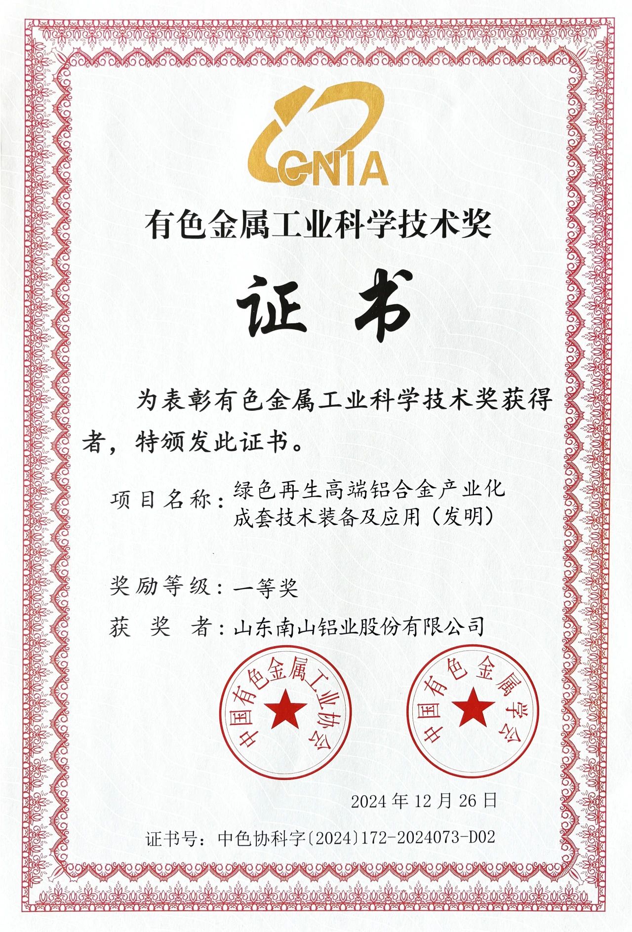 南山鋁業(yè)與北京科技大學(xué)聯(lián)合申報(bào)的《綠色再生高端鋁合金產(chǎn)業(yè)化成套技術(shù)裝備及應(yīng)用》項(xiàng)目榮獲技術(shù)發(fā)明一等獎(jiǎng)。