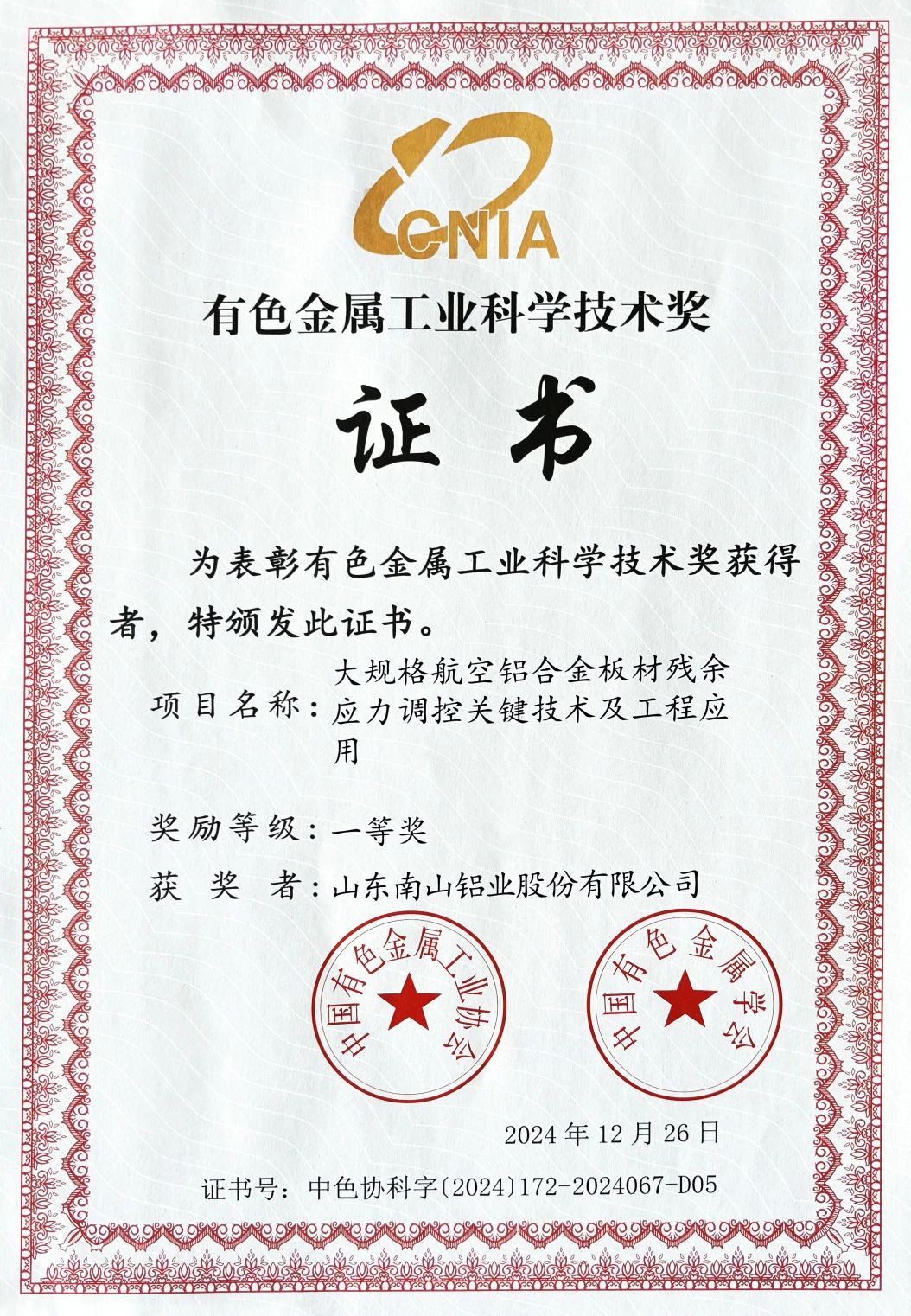 南山鋁業(yè)與有研工程技術(shù)研究院有限公司聯(lián)合申報(bào)的《大規(guī)格航空鋁合金板材殘余應(yīng)力調(diào)控關(guān)鍵技術(shù)及工程應(yīng)用》項(xiàng)目榮獲科學(xué)技術(shù)一等獎(jiǎng)。