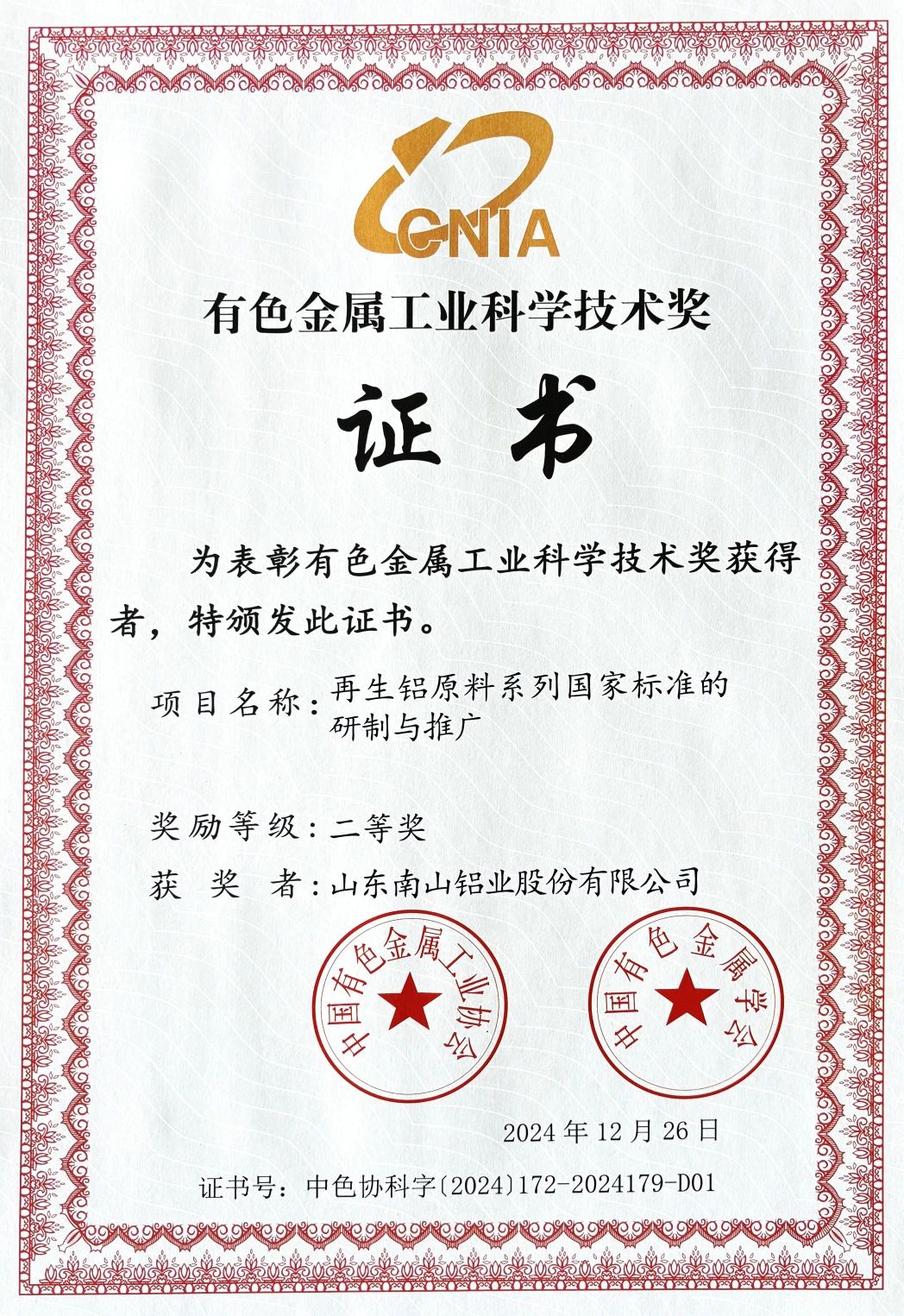 南山鋁業(yè)在再生鋁原料系列國家標(biāo)準(zhǔn)的研制與推廣方面也取得了顯著成果,榮獲二等獎(jiǎng)。