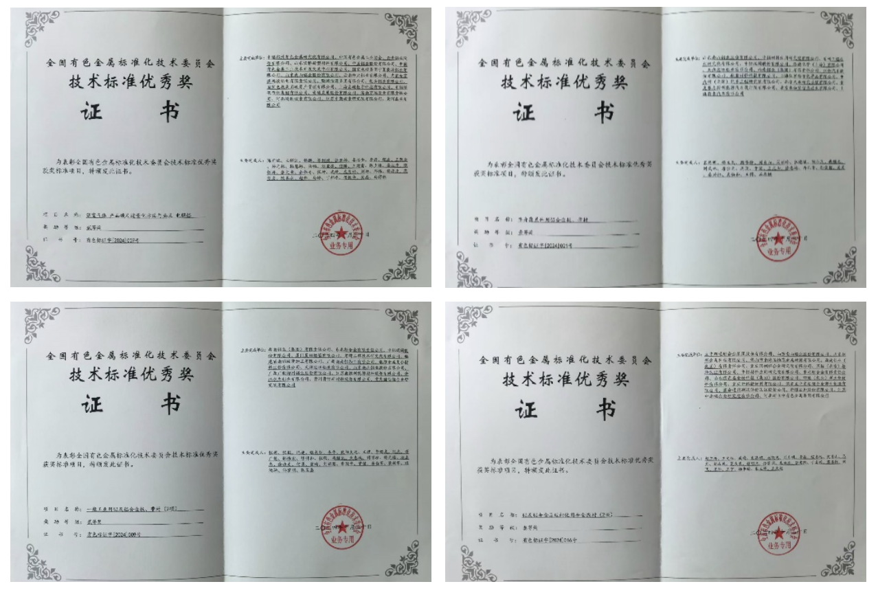 南山鋁業(yè)主起草行業(yè)標(biāo)準(zhǔn)《車身覆蓋件用鋁合金板、帶材》被全國有色金屬標(biāo)準(zhǔn)化技術(shù)委員會(huì)授予“技術(shù)標(biāo)準(zhǔn)優(yōu)秀獎(jiǎng)”一等獎(jiǎng),參與起草國家和行業(yè)標(biāo)準(zhǔn)《溫室氣體產(chǎn)品碳足跡量化方法與要求電解鋁》《一般工業(yè)用鋁及鋁合金板、帶材》《鋁及鋁合金晶粒細(xì)化用合金線材》分別獲得“技術(shù)標(biāo)準(zhǔn)優(yōu)秀獎(jiǎng)”二、三等獎(jiǎng)。